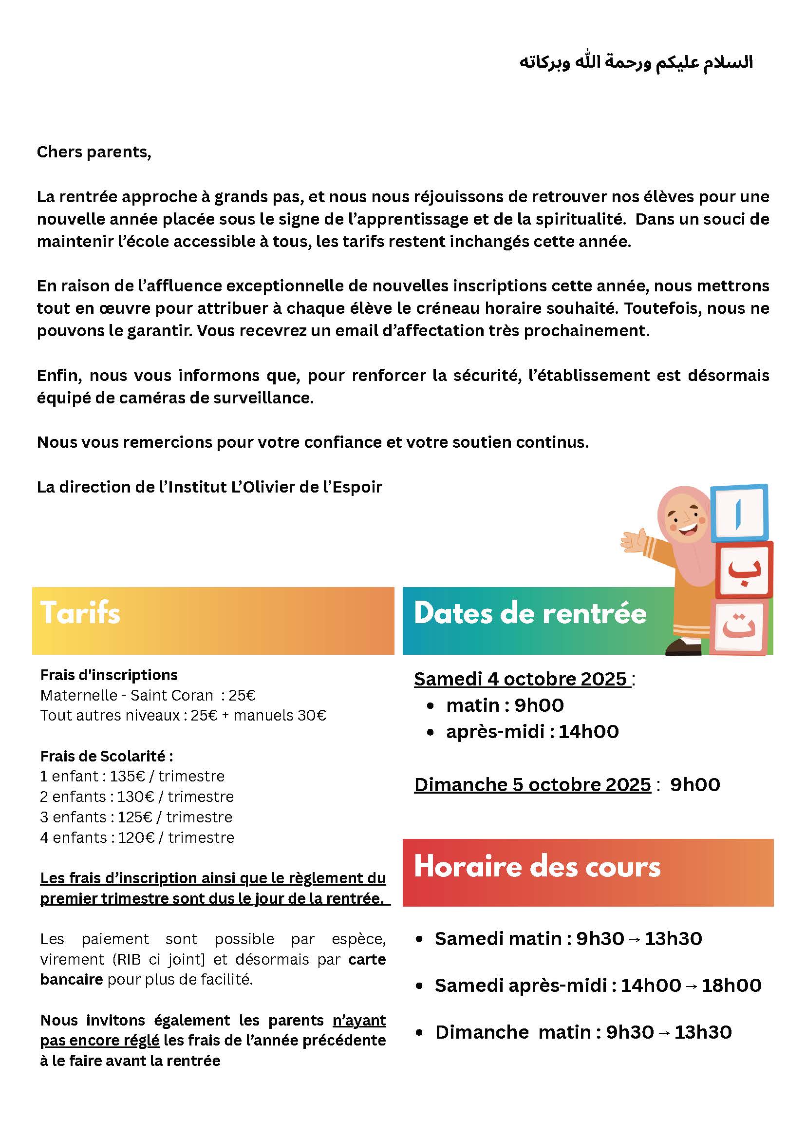 L'Olivier de la Paix fait de l'éducation sa priorité. Depuis 2004 l'Institut l'Olivier de l'Espoir dispense des cours d'apprentissage de la langue arabe et du Saint-Coran
